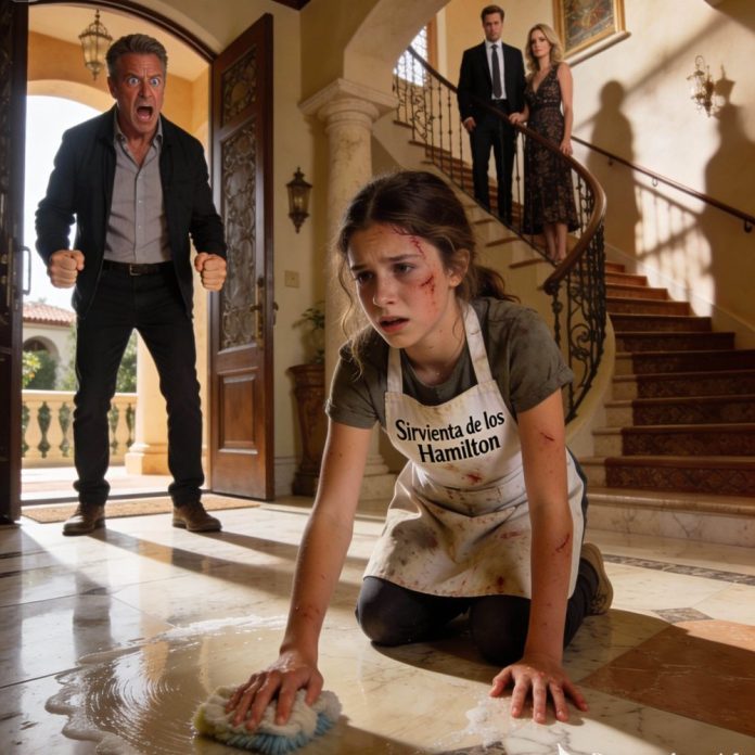 Pero cuando empujé la puerta de la casa donde me dijeron que vivía, el aire se me detuvo en los pulmones. Allí estaba ella, arrodillada en el suelo, con las rodillas marcadas por el frío de las baldosas, fregando como si la vida se le fuera con cada movimiento. Sus manos temblaban, tenía los dedos hinchados, y la piel bajo la manga corta dejaba ver moretones violáceos. Vestía un delantal viejo y sucio, y sobre él, en letras grandes, podía leerse: “Sirvienta de los Hamilton”.