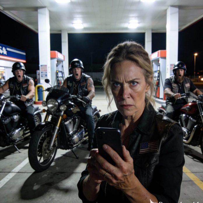 Their laughter exploded behind me when I said, “Step back.” It wasn’t nervous laughter. It was cruel, confident, the kind that came from men who believed they owned the road. I stood at the edge of the gas station parking lot, my old sedan looking painfully small next to their motorcycles. Engines idled, vibrating through the ground and straight into my bones.