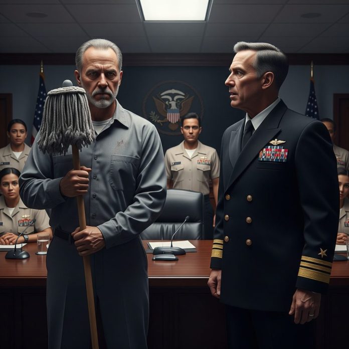 I stood there with a mop in my hand, wearing a faded gray uniform with my name stitched crookedly: Mark Hale. I had cleaned that naval headquarters for three years, long enough to know when to keep my head down. I almost stayed silent. Almost.