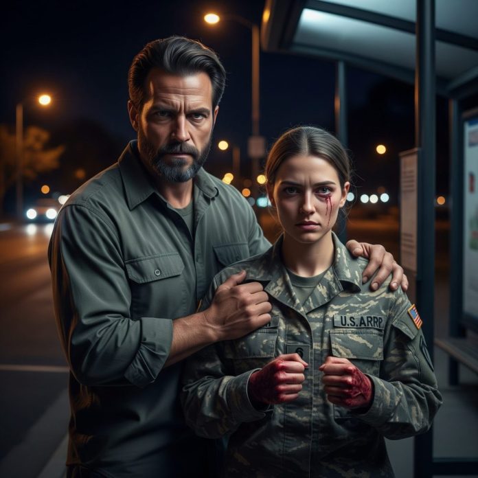 I was a single father waiting at a bus stop after a double shift, my mind half on dinner plans and half on my eight-year-old son, Ethan, when I noticed her. She stood a few feet away, stiff like she was afraid to sit down. Her Army uniform was wrinkled and dusty, her boots scuffed beyond regulation. What caught me most were her eyes—empty, distant—and the dried blood crusted over her knuckles like she’d stopped washing them on purpose.