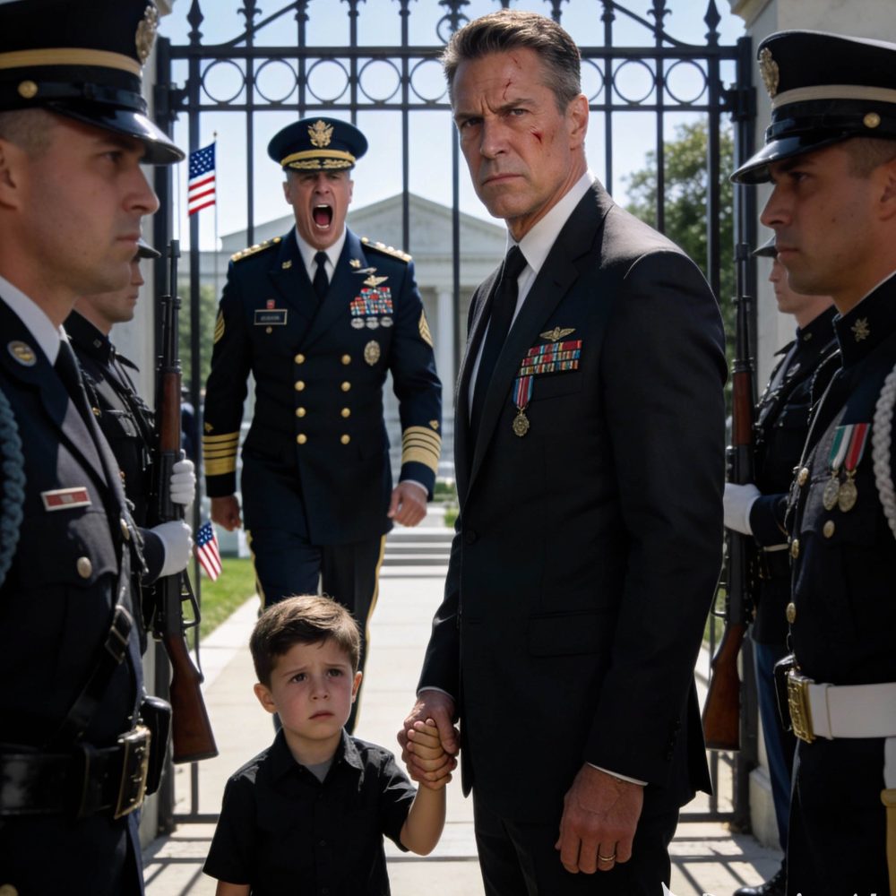 They blocked my path at the iron gates, their eyes cold, voices sharp, rifles angled just enough to make a point. The funeral of General Harold Whitman was already underway beyond the trees—flags folded, drums echoing low and slow. I tightened my grip on my son Ethan’s small hand as one guard stepped forward.