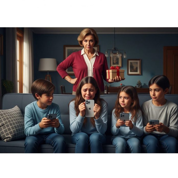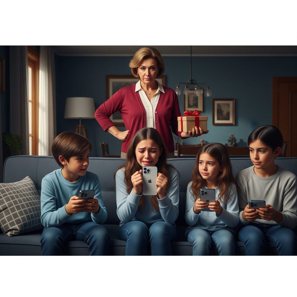 Sentí un nudo en la garganta y la rabia me ardía por dentro. Mis otros hijos, Lucas y Martina, sostenían sus nuevos teléfonos con una mezcla de orgullo y curiosidad, sin entender el silencio pesado que caía sobre Sofía. Ella estaba sentada en la esquina del sofá, mirando sus manos vacías, sin entender por qué había sido excluida. “¡Esto no es justo!”, exclamé, intentando que mis palabras atravesaran la dura barrera de indiferencia de mi suegra.