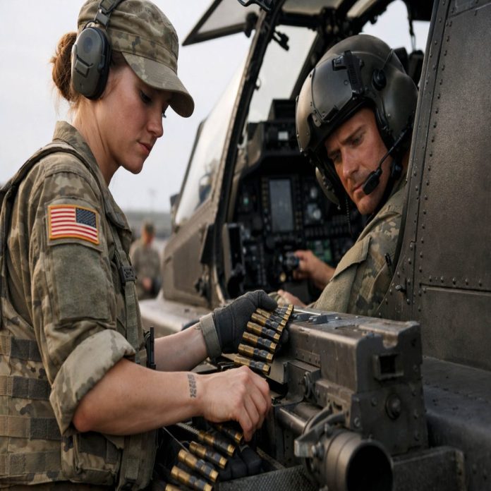 The desert air vibrated as I fed ammunition belts into the Apache’s feed tray, metal clicking against metal in a rhythm I’d memorized years ago. I was Staff Sergeant Emily Carter, aviation ordnance—quiet, reliable, invisible. That was how I survived. I counted rounds to keep my thoughts from drifting back to places I’d buried deep. One belt. Two. Three.