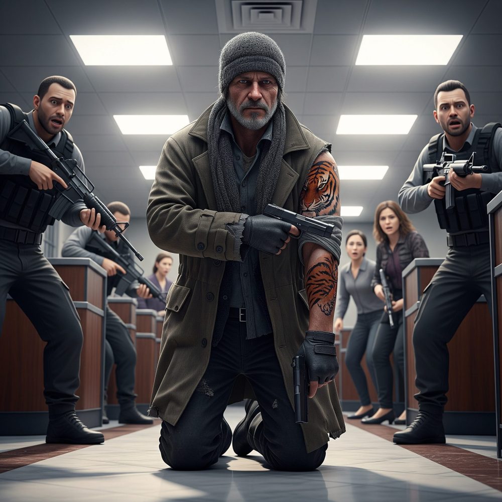 I was just another beggar slumped against the cold marble floor when the terrorists stormed into the bank. That’s what everyone thought. My name is Jack Miller, forty-two years old, unshaven, wearing torn gloves and a coat that smelled like rain and dust. The security guards were the first to go down—one pistol-whipped, the other kicked unconscious. Two local cops who had been depositing evidence bags were forced to their knees, wrists zip-tied behind their backs. Screams echoed off the glass walls. Someone dropped a phone. Someone else prayed.
