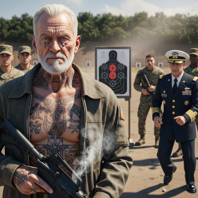 The tattoos on my chest caught the sunlight—unit numbers, dates, names of men who never made it home. The laughter faded, replaced by uneasy silence. I stepped toward the weapons rack before anyone could stop me, lifted a rifle, checked the weight, the balance. It felt familiar. Honest.