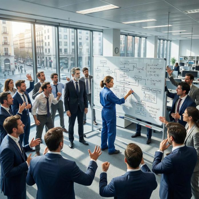 Mi nombre es Lucía Morales, y siempre he trabajado como limpiadora en distintos edificios de Madrid. Nadie me prestaba atención; para la mayoría, era invisible. Pero aquel día, algo cambió. Entré al gran salón de conferencias empujando mi carrito de limpieza, con trapos y cubetas. Veinte expertos en logística y eficiencia estaban reunidos frente a un tablero gigante, discutiendo acaloradamente. Cada uno de ellos parecía seguro de tener la respuesta, pero sus palabras se entrelazaban en una confusión interminable. El sudor les corría por la frente y algunos incluso golpeaban la mesa frustrados.