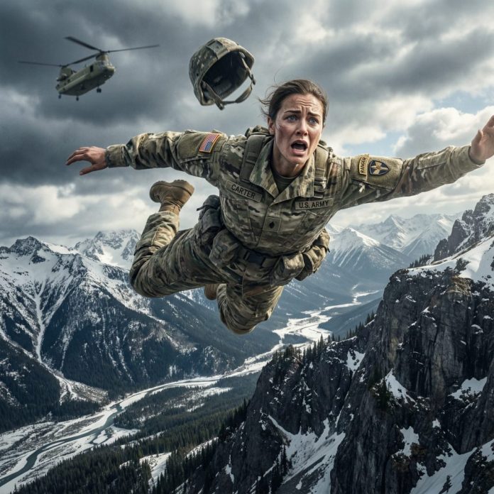 My name is Emily Carter, and the moment I stepped into empty air, time didn’t slow down—it shattered. One second I was standing inside a CH-47 Chinook during a joint mountain exercise in Alaska, the next I was gone. The helicopter bucked hard in sudden turbulence. I lost my footing. No warning. No countdown. Just air.