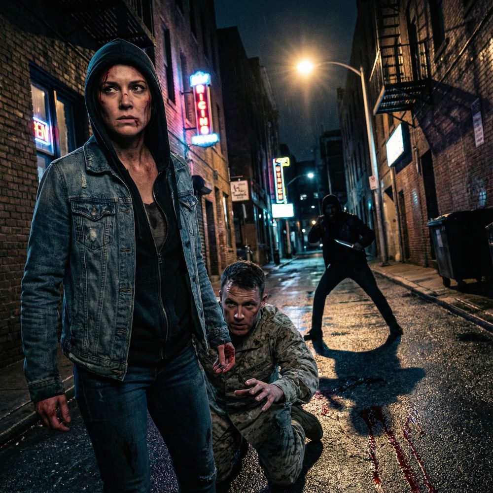 The man collapsed near the alley entrance, bleeding badly from his leg. I didn’t know he was a Marine at first—just that he was hurt and terrified. When I ran toward him, footsteps came fast behind us. A shadow moved, then the knife caught the light. I stepped in front of the wounded man without thinking.