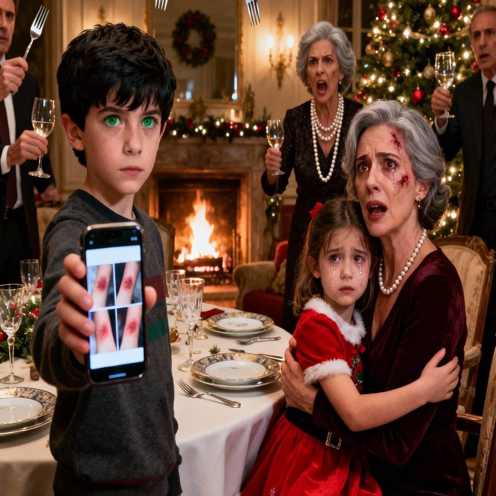 Fue entonces cuando Colton, mi hijo observador y silencioso, levantó la vista de su plato y dijo con voz firme: “¿Abuela, quieres que muestre lo que me dijiste que escondiera?” La habitación quedó helada. Todos los cubiertos suspendidos a mitad de camino, todos los ojos fijos en él. Nadie esperaba que un niño revelara secretos que habían estado ocultos durante meses. Y justo en ese momento, comprendí que lo peor de esta Navidad aún estaba por venir.