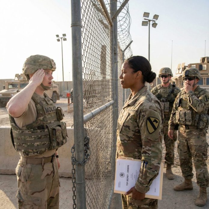 I stopped inches from the steel gate, the heat rising off the asphalt and the weight of my orders burning a hole in my jacket pocket. His name tape read MILLER. He couldn’t have been more than twenty-two. Behind him, two other guards smirked, one whispering something that drew a low laugh.