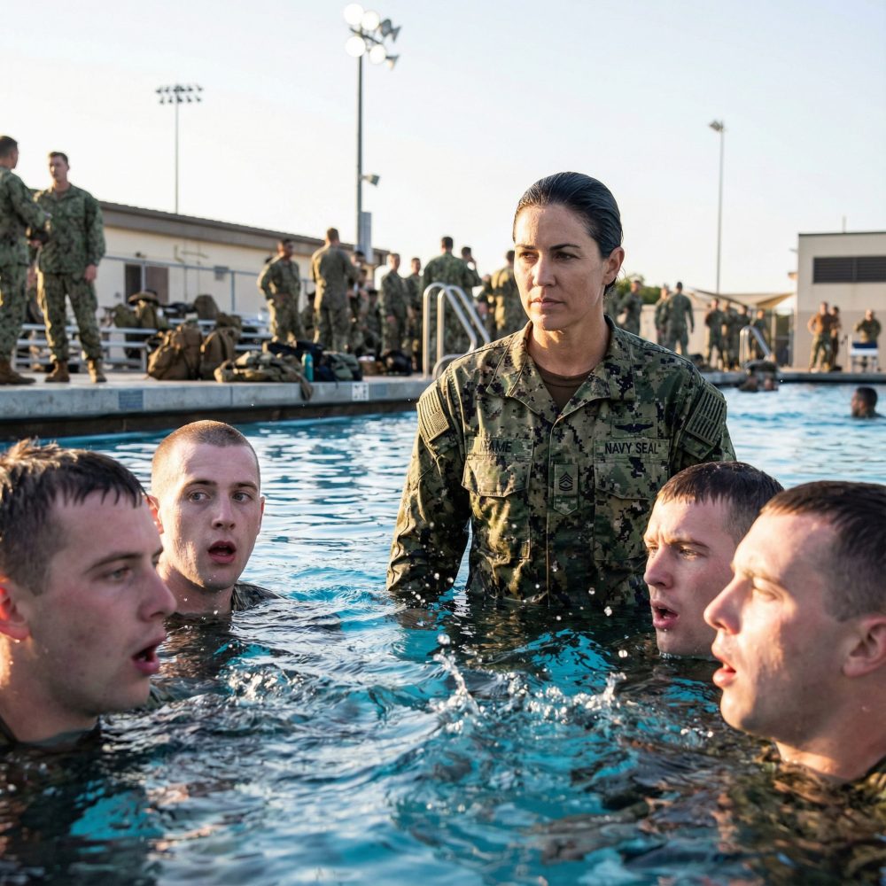 They laughed when I stepped into the swimming pool. It wasn’t loud at first—just snickers, sideways glances, the kind of casual disrespect men think no one notices. The training facility in Coronado was humid that morning, the air heavy with chlorine and ego. I was assigned to observe a joint evaluation for a new class of SEAL candidates, nothing more. At least, that’s what they believed.