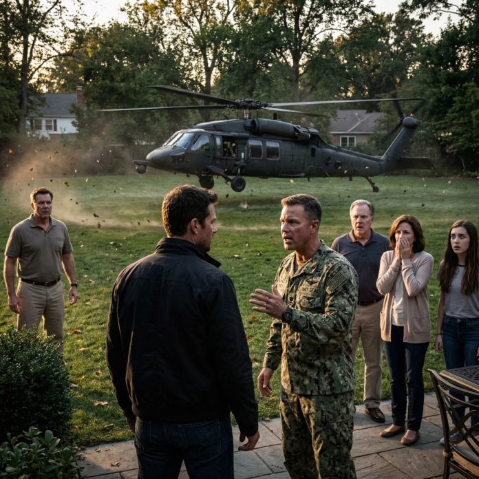 The sound grew louder—heavy, deliberate. A Navy helicopter descended into the open field behind our house, grass flattening under its force. Emily finally looked up, confused. My mother stood abruptly, her face drained of color.