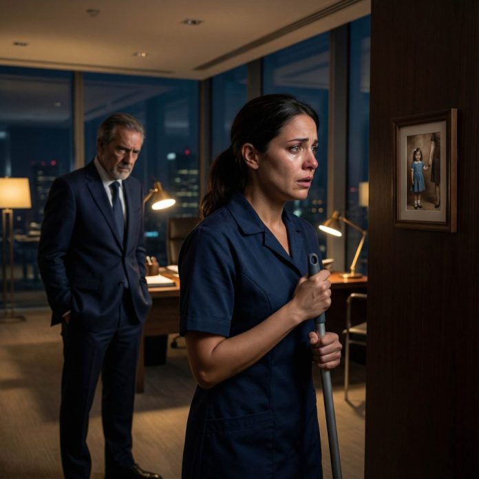Entré al despacho para limpiar, como cada noche, con la cabeza baja y la mente cansada después de diez horas de trabajo. Mi nombre es Lucía Herrera, tengo treinta y dos años y desde hace cuatro limpio oficinas en el edificio más caro de Madrid. Nunca miro demasiado, nunca pregunto nada. Pero esa noche todo cambió. En la pared, junto a los diplomas y reconocimientos de Alejandro Montes, el millonario dueño de la empresa, vi algo que me dejó sin aire: una foto de mi infancia. Yo. Con seis años. Vestido azul. De la mano de mi madre, Carmen.