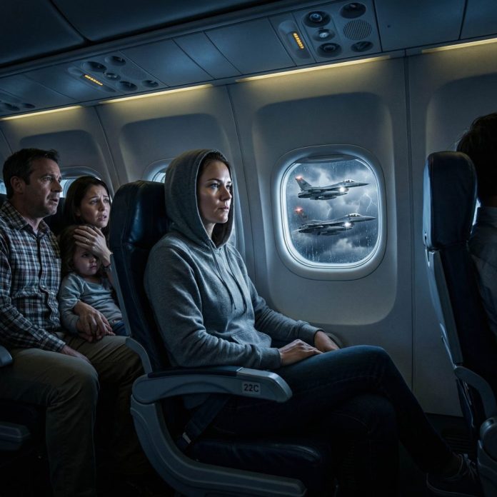 Through the window, I saw them—two F-15s sliding into position, wings close, lights cutting through the dark clouds. Gasps rippled through the rows. Phones came out. Panic followed curiosity in seconds. The same man who laughed earlier stared at me, pale now, whispering, “Is this… normal?”