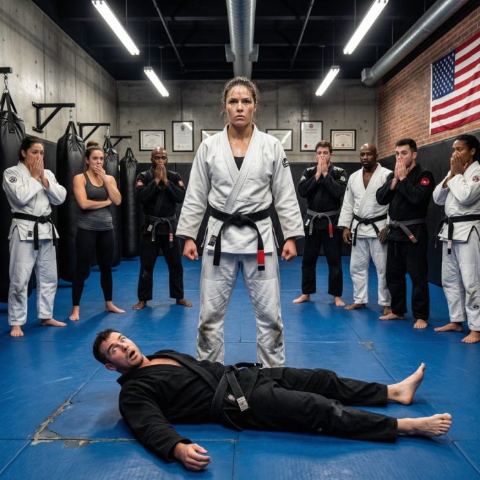 They laughed when I stepped onto the mat, the sound sharp and careless, bouncing off the padded walls of Iron Ridge Gym. I still remember the smell of sweat and disinfectant, the way the overhead lights felt too bright, too exposing. The black belt—his name was Evan Carter, a local tournament favorite—tilted his head and smirked.