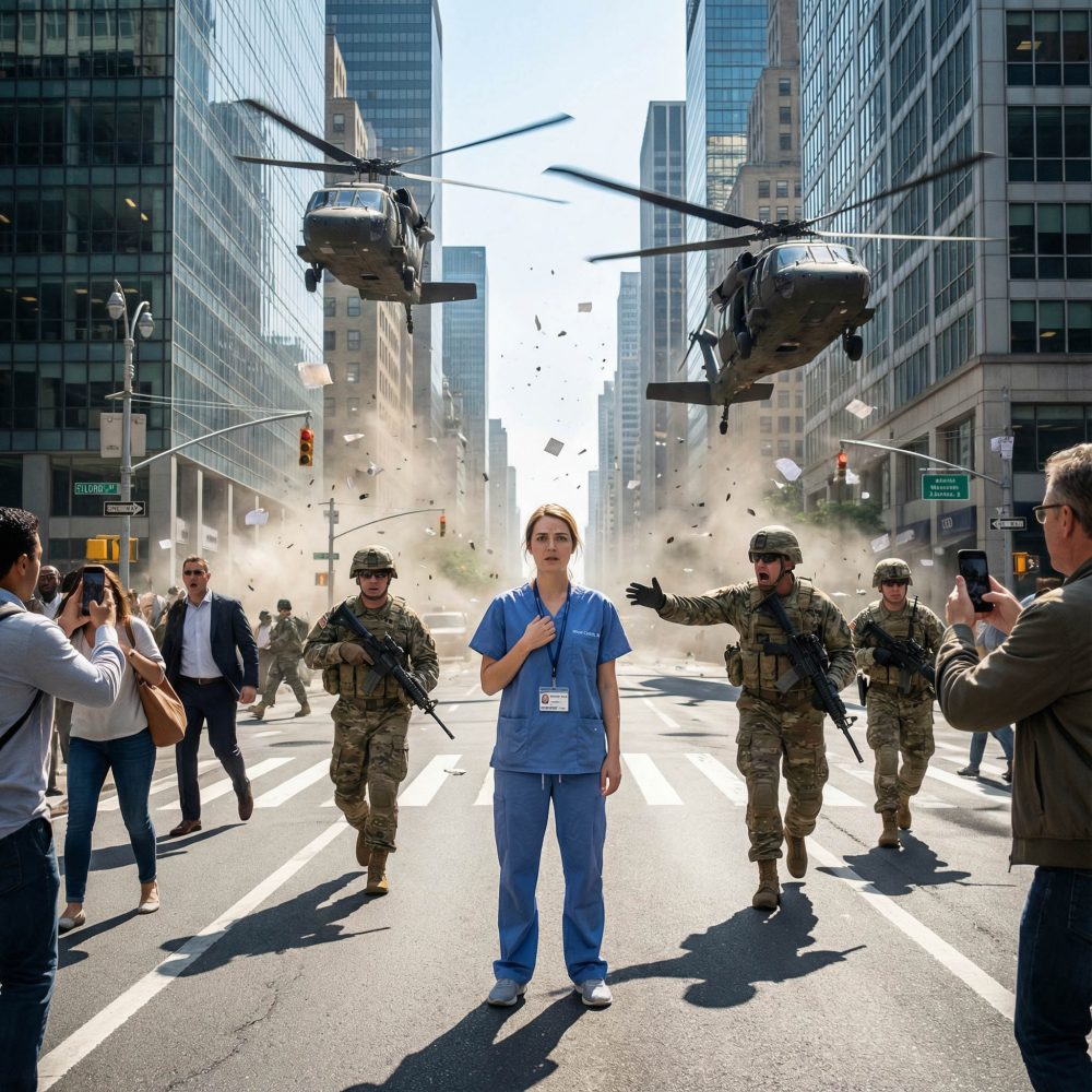 I walked home in my scrubs, replaying every second in my head, wondering how telling the truth could cost everything. I barely made it two blocks when the air split open with a deafening roar. Wind slammed trash and leaves into the air as two military helicopters descended onto the closed-off street behind me. Cars screeched to a halt. People shouted. Phones came out.