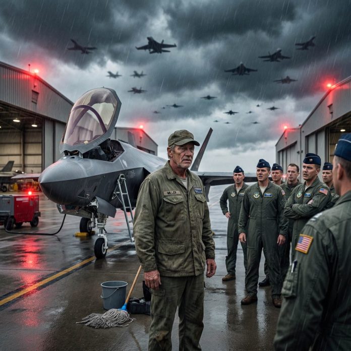 To everyone at Falcon Ridge Air Base, I was just the janitor—Mike Carter, mid-50s, quiet, invisible. I pushed my cart through hangars before dawn, mop in hand, eyes down, listening while pilots joked about weekend plans and rookies bragged about flight hours. None of them knew I used to sit where they sat. None of them knew the call sign I buried fifteen years ago.