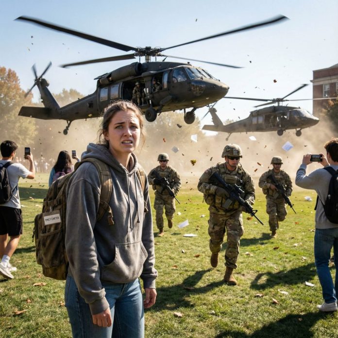 Before anyone could answer, a deep mechanical roar swallowed the room. The sound wasn’t distant—it was right on top of us. Through the tall glass windows, I saw them: two Black Hawk helicopters descending onto the main quad, rotors slicing the air like knives. Campus security ran, shouting into radios. Students screamed and started filming.