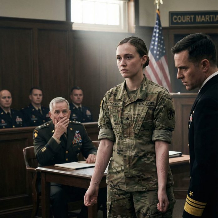 I stood at attention in the military tribunal room, boots aligned with the white tape on the floor, spine straight despite the knot tightening in my chest. My name—Lieutenant Emily Carter—echoed faintly in my head, but to the man sitting across the room, I was something else entirely.