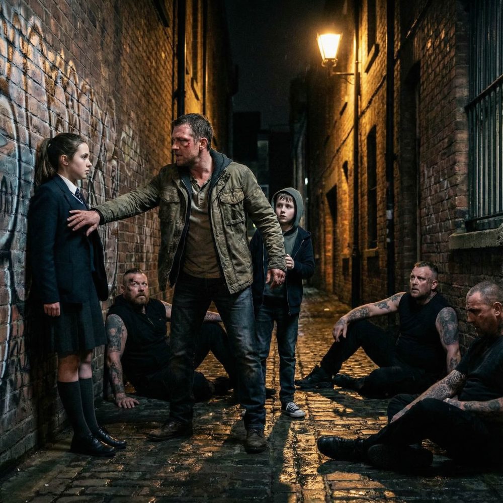 I looked down the alley and felt my chest lock up. Seven men — big, tattooed, clearly drunk or high — had a high school girl pinned against the brick wall. She was still wearing her school uniform, backpack on the ground, her face streaked with tears. One of them blocked the exit. Another leaned in too close, laughing while she begged them to stop.