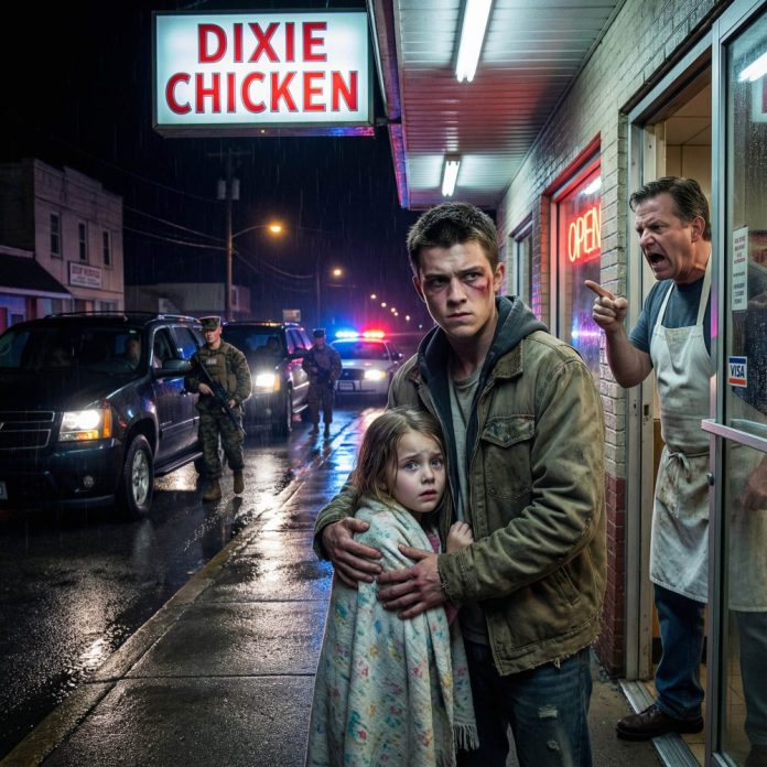 My name is Daniel Carter, and that night was supposed to be like any other late shift at Golden Fry, a fried chicken place off Highway 17. The wind cut through my jacket as I stepped outside to dump trash, and that’s when I saw her. A little girl—maybe eight years old—was huddled against the brick wall near the entrance, arms wrapped tightly around herself. Her clothes were thin, her shoes soaked from the cold pavement. She wasn’t crying. That somehow made it worse.