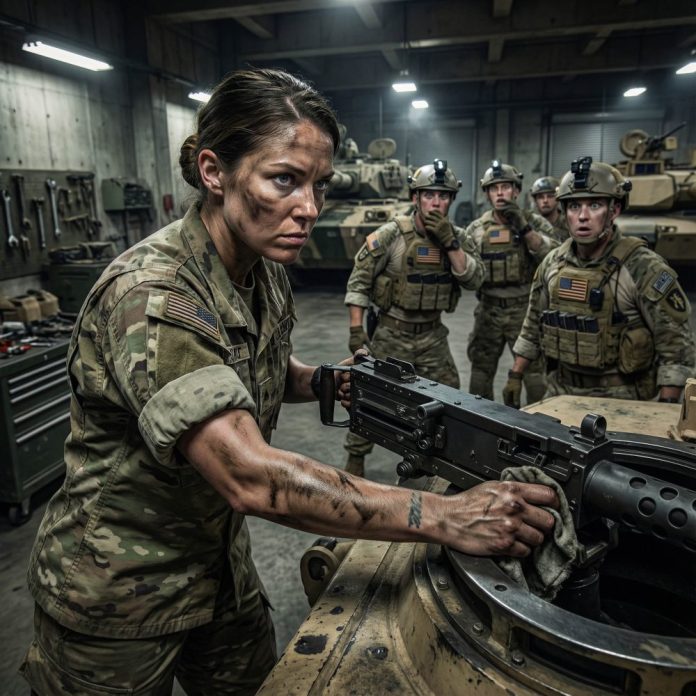 Laughter burst out as I was cleaning the machine gun coated in black oil, my sleeves rolled up, hands steady despite the heat shimmering off the armored bay. The tank crew had taken an early break, and a small group of visiting operators leaned against the rail, watching like it was cheap entertainment.