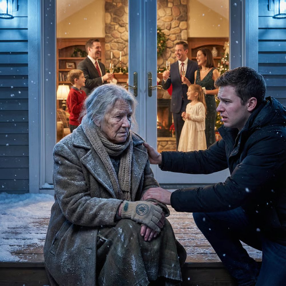 I found Grandma Eleanor shivering on the front porch, frost clinging to her wool coat, her hands stiff around a chipped teacup. Inside, the house glowed warm with firelight, laughter, and the sharp pop of champagne corks. Christmas music played softly—too softly for anyone to hear her coughing outside.