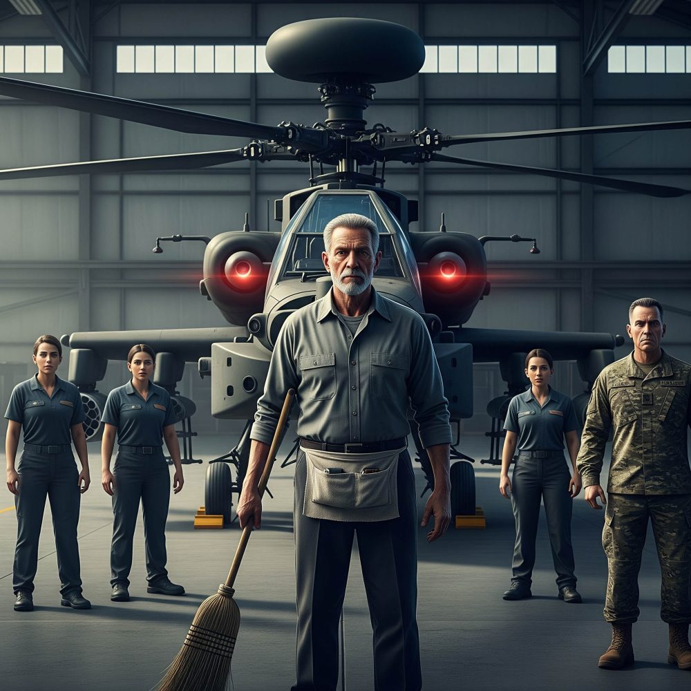 The colonel arrived fast, boots sharp on concrete. Colonel James Whitaker—I recognized him instantly, though he didn’t know me. His eyes moved from the Apache to the frozen crew, then landed on me standing there with a broom.