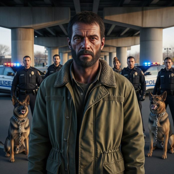 I’d been sleeping under the bridge for three years when they brought the K9 out. The river stank of oil and rust, and the morning air cut through my jacket like it always did. A small crowd had gathered near the police trucks—cops, city officials, a couple of vets from a local shelter. They were clearing the encampment. Again.