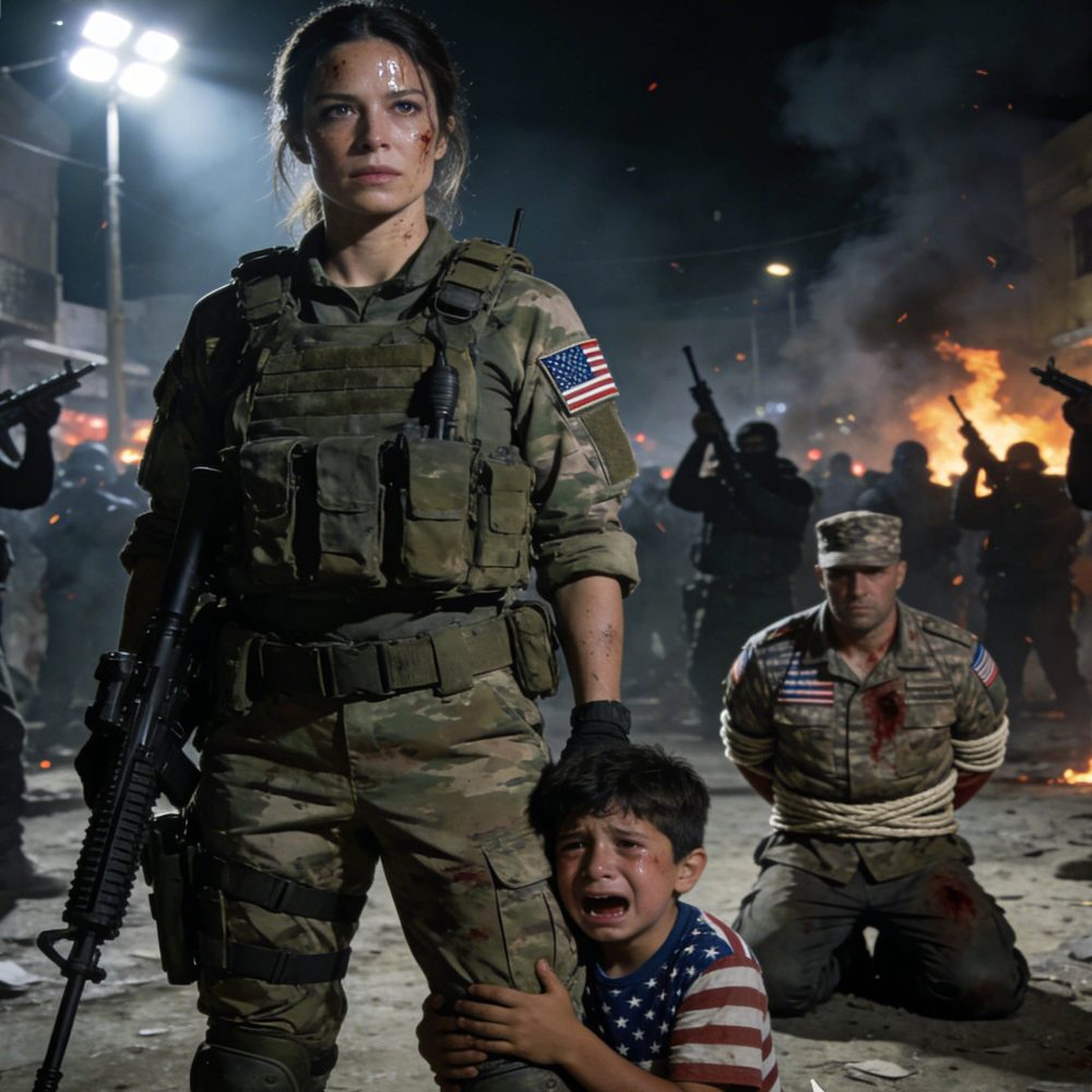 I reached a broken two-story school overlooking the square. Through a cracked window, I saw them. Armed men. Floodlights. My commander on his knees, hands bound. The boy was pressed against him, shaking.