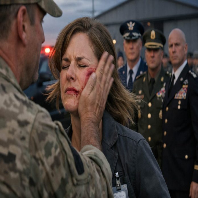 I still remember the sound of the slap—sharp, public, humiliating. It echoed across the motor pool like a gunshot. Sergeant Mark Doyle didn’t hesitate or look around before he did it. One second we were arguing about access credentials, the next his palm crashed into my face. My head snapped to the side. Someone nearby gasped. Someone else laughed nervously. Doyle leaned in close and hissed, “You don’t belong here, civilian.”