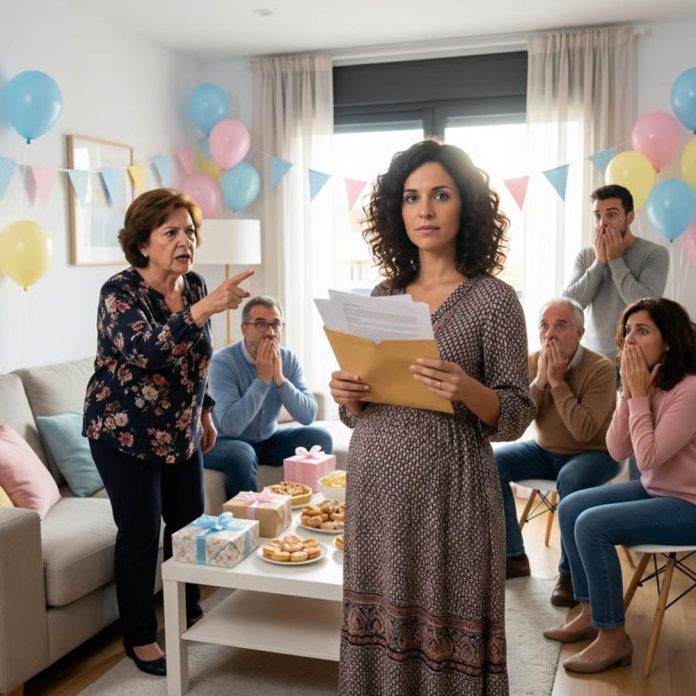 Nadie esperaba eso en mi baby shower. El salón estaba lleno de globos pastel, risas forzadas y música suave. Yo, Laura Martínez, intentaba disfrutar del momento mientras acariciaba mi vientre de siete meses. Daniel, mi esposo, sonreía nervioso a mi lado. Entonces mi suegra, Carmen Rodríguez, dejó su copa sobre la mesa y se levantó sin pedir permiso. Su voz cortó el aire: