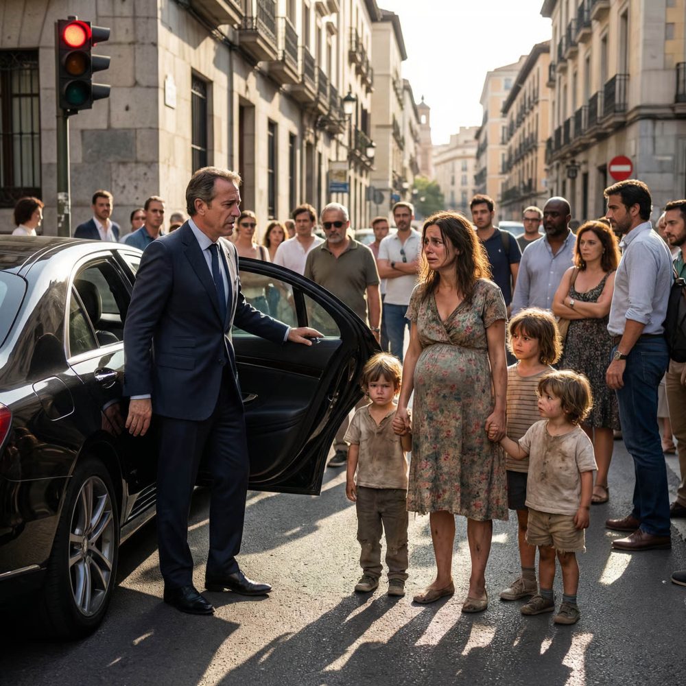 Nunca pensé que la volvería a ver así. Embarazada, temblando, rodeada de tres niños sucios frente a mi coche de lujo. El semáforo acababa de ponerse en rojo cuando ella se acercó.