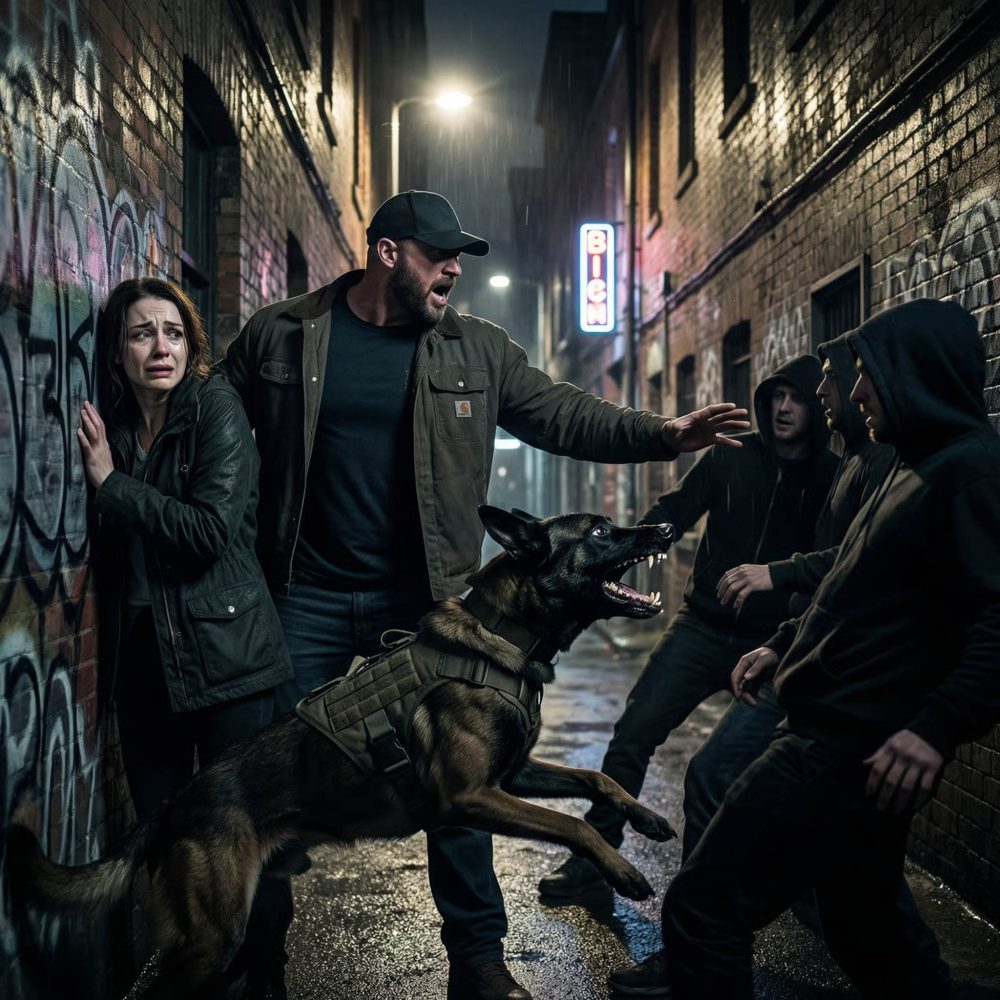 Before I could even process what was happening, a large dog burst forward like a missile. He slammed into the man closest to me, knocking him to the ground. The alley exploded into chaos—shouting, cursing, the sound of bodies hitting concrete. The dog moved with terrifying precision, barking and snapping, forcing the men backward.