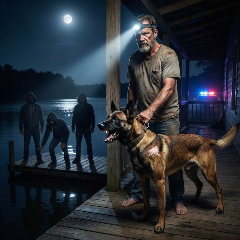 I stepped onto the porch barefoot, calm from habit, anger rising by instinct. Years in uniform had trained my body to move before my thoughts caught up. Moonlight spilled over the water, and that’s when I saw them—three men near the dock, one holding a broken paddle, another gripping a flashlight like a weapon. They weren’t teenagers joyriding. These were grown men, confident, deliberate.