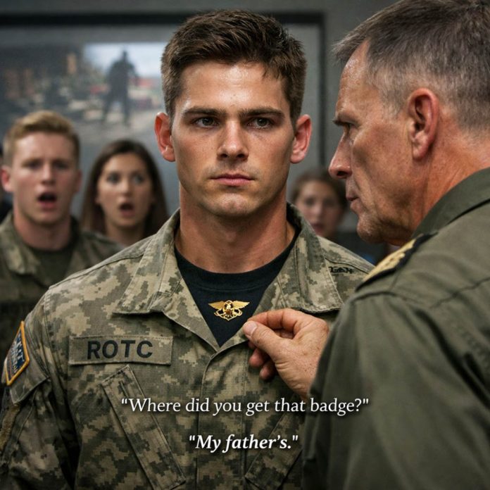 As he turned to face the class and snapped to attention, the collar of his uniform shifted. For a brief second, a small metal insignia—old, worn, unmistakable—caught the light. Captain Hayes’ breath hitched. He stepped closer, eyes locked on the symbol.