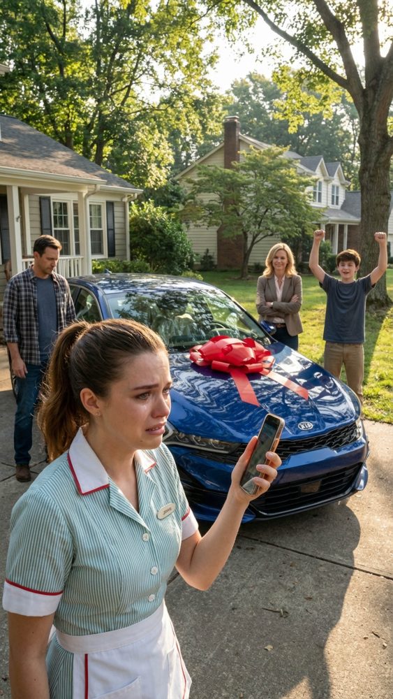 The next morning, that car sat in our driveway like a trophy—shiny paint, spotless rims, a huge red bow taped to the hood. I stood there in my work uniform, the smell of coffee still clinging to me, trying to make sense of what I was seeing.