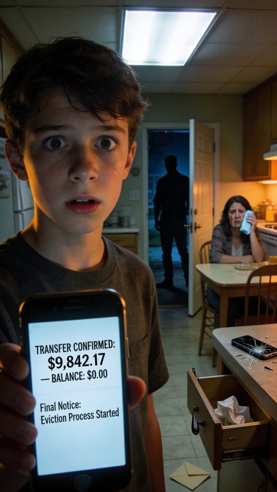 “This house is mine,” he spat, yanking open the kitchen drawer where Mom kept our savings in an envelope and a little notebook. She’d been saving for years—tips from the diner, overtime from cleaning offices, every spare dollar tucked away for rent, school supplies, and a future that didn’t feel like walking on glass.