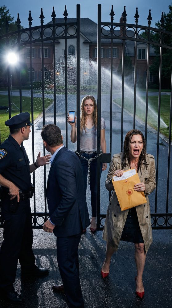 Water blasted across the hedge and soaked the driveway. Denise shrieked, jerking the envelope up to shield it. The clear window fogged, pages bending. Vince cursed and lunged a half-step—just enough for the officer to move in front of him.