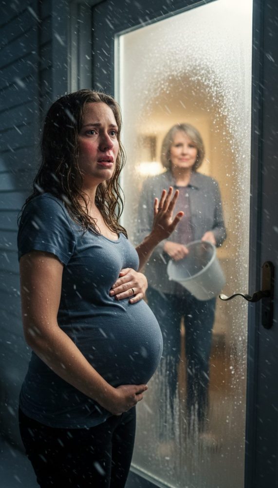 The cold was instant and violent. Water soaked through my sweater and leggings, then the wind turned it into needles. My hair plastered to my cheeks. My hands shook so hard I could barely keep them on my belly.