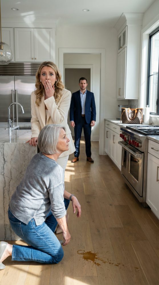 “De rodillas,” ordené, señalando un derrame que a propósito había provocado—café escurriendo por el gabinete como una prueba. “Limpia eso.”