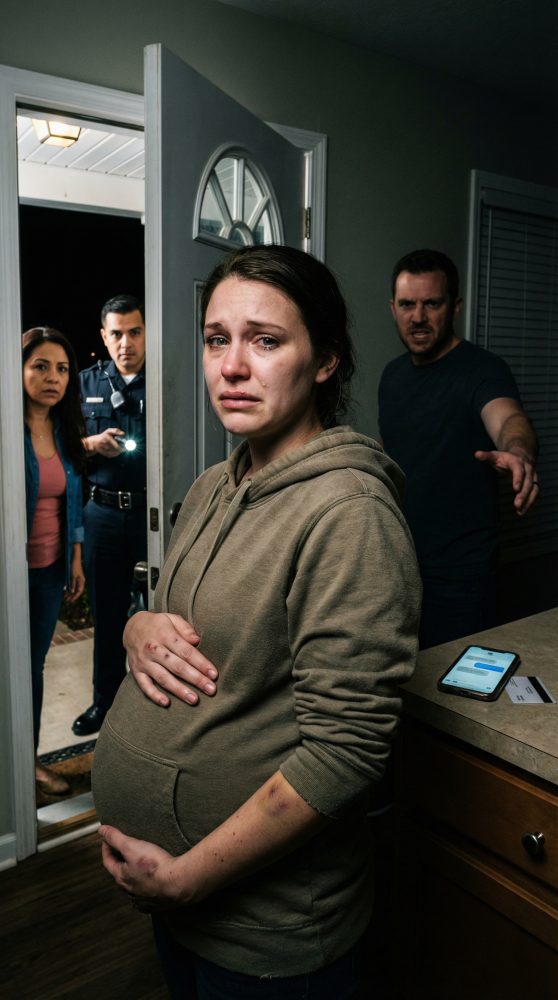 His hand hit my wrist first—hard. Then he shoved my shoulder. It wasn’t cinematic. It was quick, ugly, real. The counter edge caught my hip, and pain shot down my leg. My baby kicked, sharp and frantic.