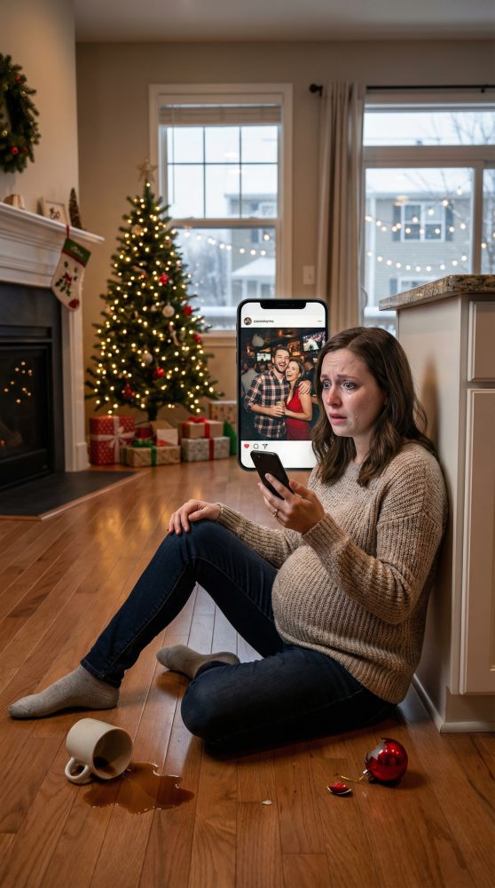 Snow drifted past the window while my body betrayed me in waves. My phone skidded across the floor. A warm rush soaked through my leggings. I tried to stand and couldn’t. Christmas lights blinked calmly as I screamed into an empty house.