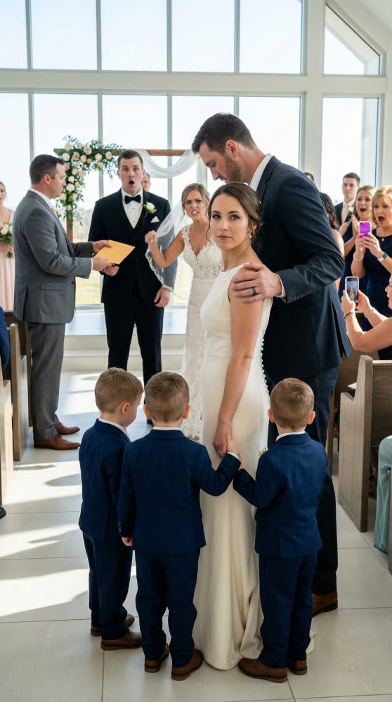 Hannah se salió de la alfombra central y se acercó, el ramo temblándole. “No sabía que vendrías con… niños,” dijo, con una sonrisa delgada. “Caleb me dijo que estabas sola. Que seguías… siendo tú.”