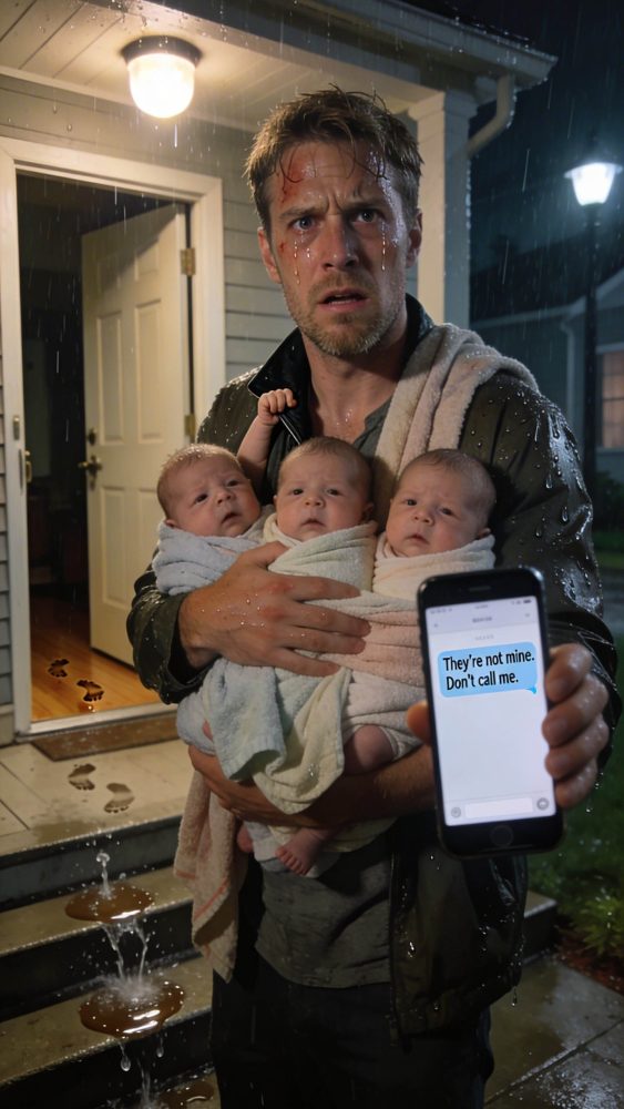 On the porch steps, my triplets were bundled in a soaked blanket like someone had tossed groceries in the rain. Lily’s cheeks were blotchy and red. Miles’ tiny fists opened and closed like he was trying to hold onto something invisible. Nora’s lips were turning a frightening shade of blue.