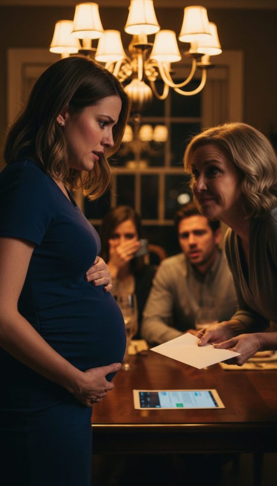 My stomach tightened as the baby kicked, and every face turned toward me—judging, waiting. I tried to speak, but Diane cut in first, loud enough to make my ears ring: