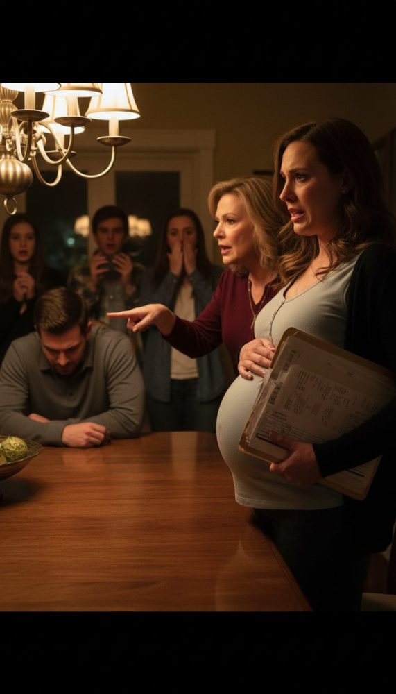 My stomach tightened as the baby kicked, and every face turned toward me—judging, waiting. I tried to speak, but Diane cut in first, loud enough to make my ears ring: