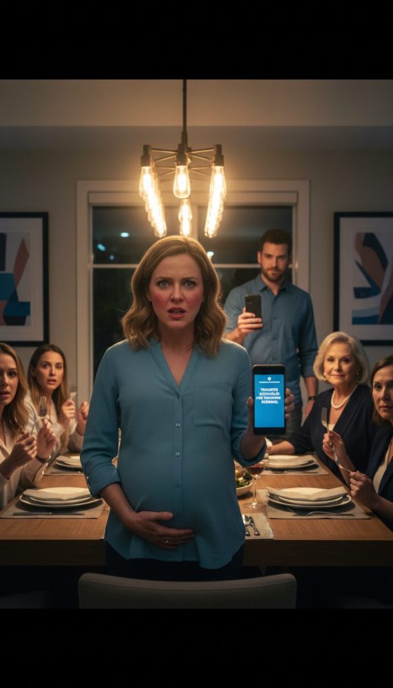 It was Ryan’s cousin’s engagement dinner—one of those loud, crowded nights where everyone takes turns telling stories that aren’t funny, but you smile anyway because that’s what families do. I wore the only dress that still fit comfortably, one hand resting on my belly like an anchor.
