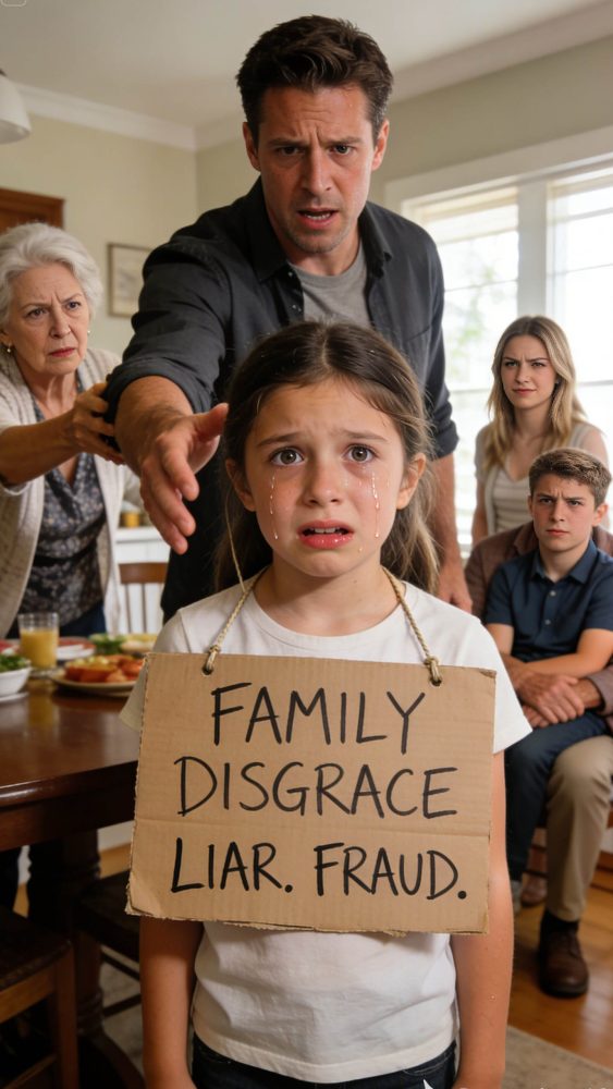 Me quedé paralizado cuando mi madre le metió a la fuerza un cartel de cartón en las manos a mi hija de nueve años. “Póntelo”, siseó, lo bastante alto como para que todos lo oyeran. El rotulador negro gritaba FAMILY DISGRACE sobre su pecho y, debajo: LIAR. FRAUD. Mi sobrino sonrió con suficiencia desde el regazo del abuelo, como un príncipe coronado. Los ojos de mi hija se llenaron de lágrimas—“Papá, ¿qué hice?”