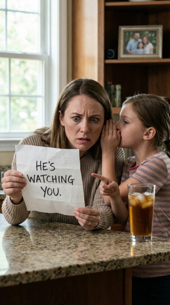 Sus ojos se desviaron hacia la encimera de la cocina, donde Jenna había dejado un vaso alto de té helado “para mí”, con gotas de condensación deslizándose por el cristal como si estuviera sudando. La manita de Emma temblaba cuando me metió a la fuerza un papel arrugado en la palma.